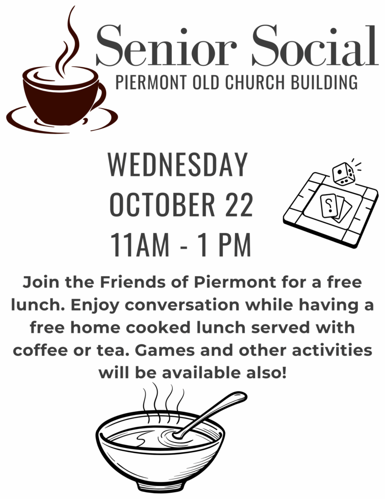 Posted on October 16, 2025, Edited October 16, 2025 by Sarah Tucker Friends of Piermont Present: Senior Social October 22, 2025 11:00AM – 1:00PM Piermont Old Church Building